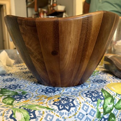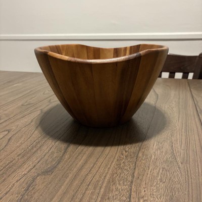 This wooden bowl is praised for its beautiful design and versatility, making it ideal for salads, entertaining, and even as a decorative piece. Guests appreciate its aesthetic appeal and functionality, though some have noted issues with the serving utensils and occasional quality concerns.