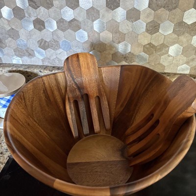 This bowl is absolutely gorgeous!!! It’s a great size for a huge salad! The wood is high quality and so pretty. The salad tongs are perfect for tossing and serving it washes pretty well. Although, I’m careful to make sure I dry it immediately. It will make the perfect wedding gift or house warming gift. I also like that the tongs have a little notch on them so that they can hang on the bowl. I received an incentive to write this review.