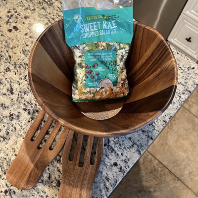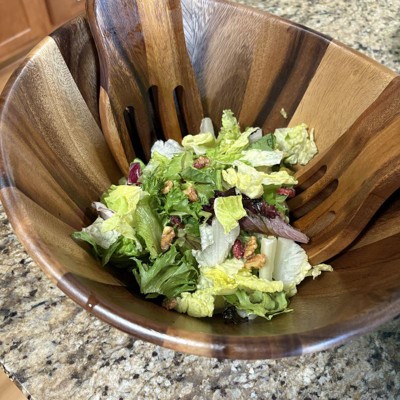 Gorgeous wooden salad bowl! Holds a lot of salad - my usual “large” mixed salad hardly filled half of this bowl. Included servers are easy to use to serve salad from the bowl, but there is an awkward knob on the backsides of each “fork” server. Bowl is easy to clean and will be beautiful on our table for serving. It will also now be my go to dish for taking salads to friends’ houses too! I received an incentive to write this review.