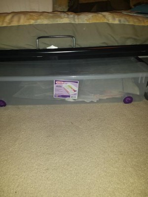 This large Underbed box is very nice and attractive. I am very pleased with the convenience of the purple wheels for rolling it. You simply pull back the handles on the sides to open the lid and clamp forward to lock it in place. I could not use it for underbed storage because the height of the bed is too low, My husband and I find another solution for its purpose. We decided to use it to store extra paper documents and rolled it under the lounge chair in our Study room. Pretty neat product!