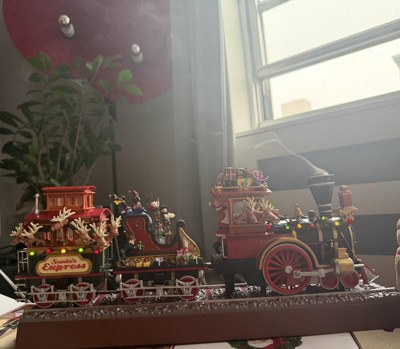 All aboard The Santa's Express from Mr. Christmas. This highly detailed heirloom-quality gift measures approximately 16.75" long and if filled with animation, lights, and music. Watch the wheels turn as Santa, his reindeer, and the elves help move the train along with their animated antics. An LED light string illuminates the train, and real smoke blows out of the smokestack with the included liquid dropper. This locomotive plays 20 Christmas carols and classic railroad songs that bring the whimsical scene to life. Built-in volume control allows you to enjoy with or without music, and AC adapter operation makes for easy setup.