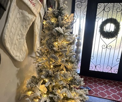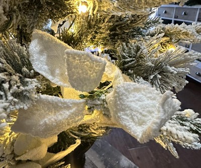 This tabletop Christmas tree is very beautiful and well made. It lights up and is very full. The two reasons for the 4-star review is because (1) The white flocking on the branches sheds so it’s a bit messy (2) Some of the white flowers wouldn’t flatten out even with trying to press them into place (see photo). Even so, it’s a lovely tree and worth the money.
