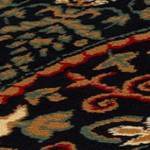 • A: The rug features a circular floral design with blooming florals and foliage on a black foundation.