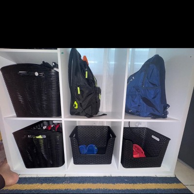 Bring texture and functional style to your home with this Y-Weave Easy Access Storage Bin from Brightroom™. Made with plastic in a Y-weave, this rectangle storage bin features an open design with front cutout to make it easy to stash away your towels, blankets and more. The side cutout handles allow easy lifting and movement around your home. Suitable to place on any shelf or closet, this solid-color storage bin mixes up well in a variety of decor styles and boasts a nesting design for convenient storage.
