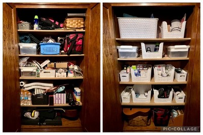 These are great for getting things in order without spending a fortune. They make organizing fun (but I might be a little weird that way). This basket in particular is pretty roomy and offers good visibility of the contents.