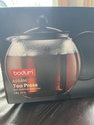 Bodum 34oz Assam Tea Press with Stainless Steel Filter: Glass Teapot & Infuser, Dishwasher-Safe, Black Handle