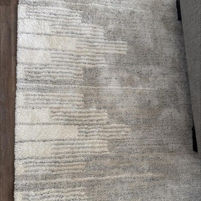Shipped to me fully wrapped and no smell. I do like that it’s slightly more plush than other Target rugs. However, I got the 5x7 and it looks like the way it was cut, the design is concentrated to one end of the rug so it looks off-centered. Also, as you walk over the rug, it gets splotchy so you can tell where someone has walked. In other words, one area of the rug will have its design intact whereas any areas you’ve walked will have these splotches and you can’t even see what the design is supposed to be. Not crazy about that at all. I was also hoping this would be a tad more closer to white. It’s definitely a light cream. Also in softer/warm light, the carpet design appears more of a light brownish instead of the more light silvery gray I was expecting. However, I’m thinking in a brighter light that might not be the case (but who wants bright lights in their bedroom which is where I have this rug). Overall I like the extra bit of cushioning and softness, but the design and colors are somewhat disappointing. Unsure on whether I’ll keep this