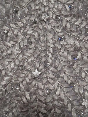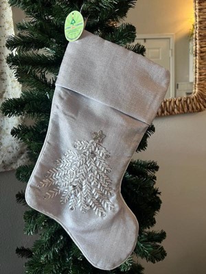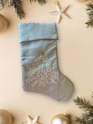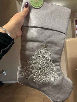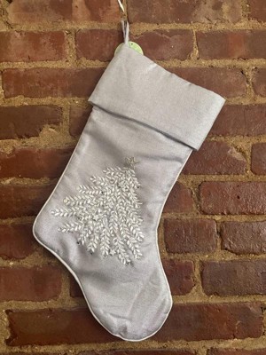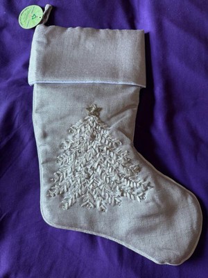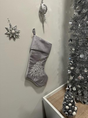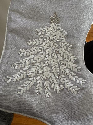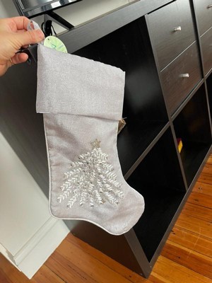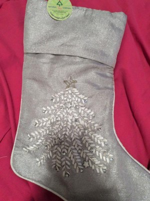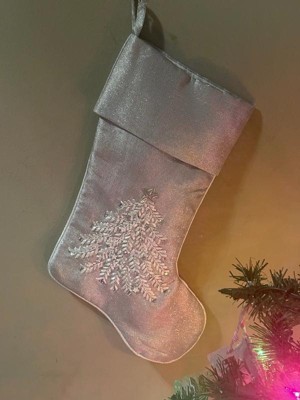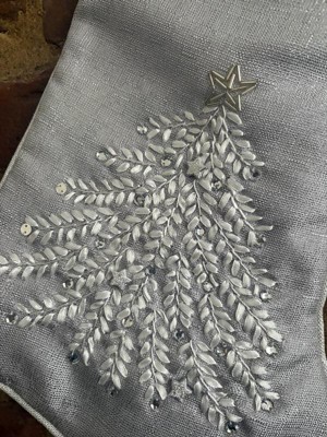 [This review was collected as part of a promotion.] Beautiful light shimmering gray Christmas stocking just beautiful. The material is soft silky and really pretty. The embroidered Christmas tree is gorgeous. The embellishments make it just shine.