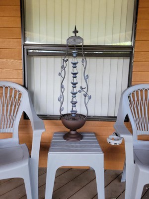 [This review was collected as part of a promotion.] I really like this Indoor/Outdoor Metal Hanging 7-cup Tiered Floor Water Fountain in Bronze. It makes a nice addition to my back patio with its soothing sound. It was pretty easy to put together, considering I have never put a fountain together before. I like that the size is just perfect, it's not too big or too small.