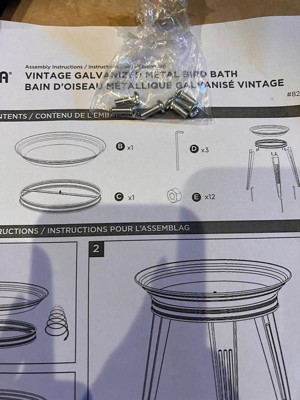 This item had directions that did not match the item enclosed. There were 6 small screws (never pictured in the text), and 0 nuts (12 nuts were pictured). After figuring out on my own how to put the legs on the round base, the bowl was screwed on and has a large gap the causes the bowl to wobble. The only choice available is to run a wide bead of clear silicone caulk around the base of the bowl to attempt to correct the wobble. I will keep the misshapen bird bath because it is the only galvanized item available. However, this should be $30 not $61. Target should not offer this below par item.