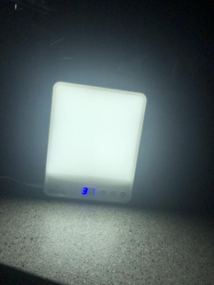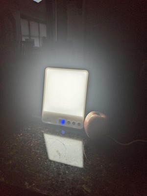 I was excited to try this light, as I have mild depression that is exacerbated by a lack of sunlight—a real problem during a Midwestern winter! I’m so glad I tried it, because the light works very well for me. I definitely feel an energy boost after I use it! Even on the lowest setting, the light is bright and effective; the photo I’m including shows the lowest setting. Other lights were on in the room when I took the photo, but because the light is so bright, it makes everything else around it look dark.