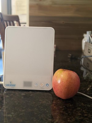 This was my first time using a light therapy lamp and boy is it BRIGHT! I thought it would give a nice glow off and I could use it while watching TV or working on my computer but there's no way. If you had the time to sit with it in front of you and you could shut your eyes while using it that might work. It's a nice small size (apple in picture for reference) and I like that there's a timer, but it's not for me