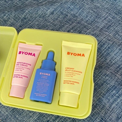 This kit is the BEST for travelling! Includes my three favorite BYOMA products - the cleanser is super effective but still gentle, the hydrating serum is PERFECT for winter, and the gel cream is lightweight and absorbs into my skin so nicely. Highly recommend!