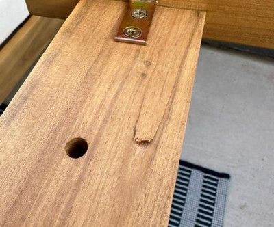 The wooden patio set looks great once put together & was easy to assemble. But as others mentioned the wood split when using the tool to put the screws in. Target was great & worked with the 3rd party seller & they shipped me replacement parts but the seat of the loveseat split again & worse than the first one! Didn’t try to switch out the split arm pieces on the chairs. Will be returning the entire set & looking for something different! Disappointing, frustrated & annoyed…I have to dissemble the entire thing to return to the store.