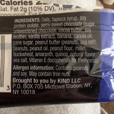 oats, tapioca syrup, soy protein isolate, semi-sweet chocolate (sugar, unsweetened chocolate, cocoa butter, soy lecithin, vanilla extract), bananas, canola oil, cane sugar, peanut butter (peanuts, sea salt), peanuts, peanut oil, peanut flour, millet, buckwheat, amaranth, quinoa, natural flavor, sea salt, vitamin e (tocopherols to maintain freshness)' '