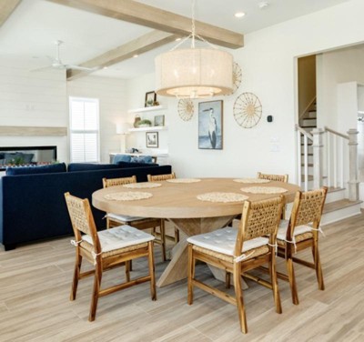 • A: The dining chairs feature a hardwood frame combined with a woven seat and back for durability.