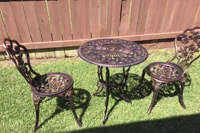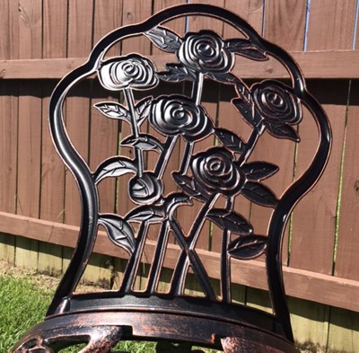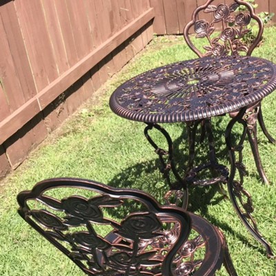 This Rose Cast Metal 3 Pc. Bistro Set will be a beautiful addition to your front porch, patio, deck, balcony, garden or other entertainment area. Bistro sets are perfect for any small space, or to accent a larger space. It is constructed of rust-free aluminum and durable cast iron. This bistro set features a hardened, powder-coated finish for years of beauty. The set includes a bistro table with an umbrella opening and two bistro chairs.