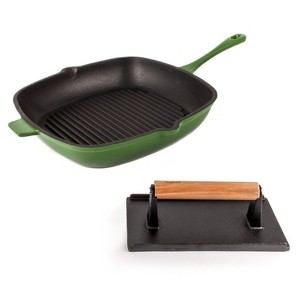 - Package includes: Bacon/Steak Press, 11" Square Grill Pan. Elevate your cooking experience with our eco-friendly grill cookware set, crafted from durable cast iron material, equipped with enamel coating, glossy base. Bacon/Steak press features a stay-cool, bamboo ergonomic handle. Includes hanging loop for convenient storage.