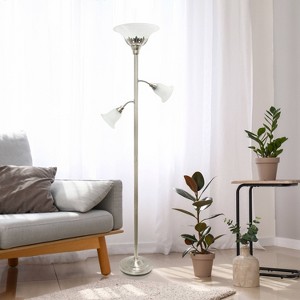 Brighten up your living space with this elegant 3 light 71" floor lamp. It features 2 adjustable reading lights with a main torchiere light so that you can manipulate the light to focus on the area of your choice. The beautiful brushed nickel metal base is accented by scalloped white glass shades to complete the timeless look. Perfect for your bedroom, office, foyer or living room!