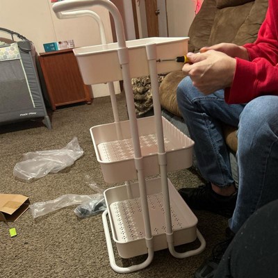 This white rolling cart is amazing! I purchased 3 of them to use in my kitchen. I have very limited kitchen cabinet space, so, I purchased the carts to use as a makeshift rolling pantry. I'm sure that sounds odd, but by consolidating my dry goods onto 3 rolling carts, it's been very effective. The carts sit flush against a wall and are easy to glide across my kitchen floor to retrieve items that I need for food preparation. Very easy assembly, a screwdriver and small wrench were included. Easy to understand directions, too. The cart is lightweight yet sturdy. The cart doesn't tip over whilst rolling it around. I definitely recommend this rolling cart. Exceptional quality and sleek design.