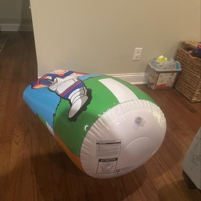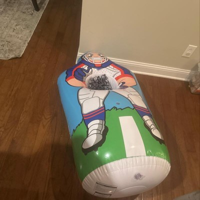 4 ft tall inflatable trainer. Great for hand, eye coordination, OT and just for fun. Be sure to fill the base with water or sand before blowing up inflatable. You have to blow it up using your own man power. Comes with a soft football and baseball that are also inflatable. Inside or outside use.