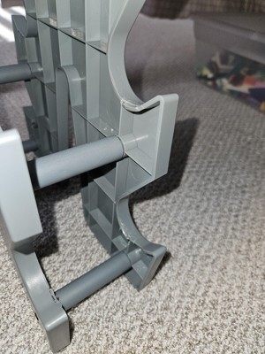 Really excited that I found a compact weight stand for my bedroom. I only keep the weights on it that were provided. Noticed after a month or so that the holders are cracking. Super disappointed in the quality.