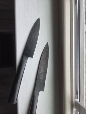 Very upset with this knife set. The black has faded and started to come off on the food. This knife set is not safe.