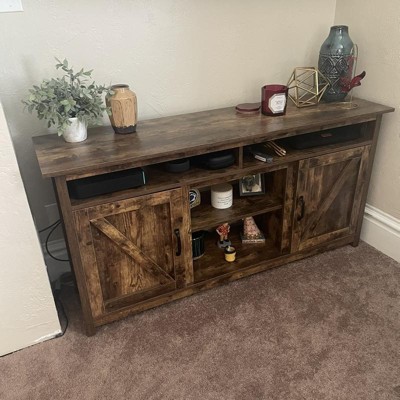 I selected this particular TV stand because of it's height, I needed a taller option because I am not able to wall mount my TV in my current house. This is the perfect size for my 55 inch television, with just a bit of space left on each side to keep it well supported all the way around. I was happy this had the circular cut-outs for cords through the back board, as I have a lot of different cables that need threaded through. I had no problem assembling this all on my own though it would definitely be easier with a second person. I made the decision to leave the "barn doors" off because they really just aren't my style and I like having the easier access to the shelves. I did keep the doors and hardware, just incase I decide to put them on at a later date but I think it looks great as it is.