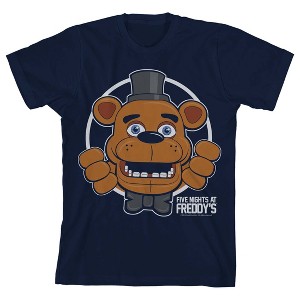 Get ready for Freddy with this youth tee. The shirt features Freddy Facebear's face inside a navy circle. The circle is outlined in white, and a pair of bear hands appear next to Freddy's face. The game's title is printed in white underneath the image. The tee comes in a navy short sleeve crewneck. Young fans of the Five Nights at Freey's games will love this t-shirt.