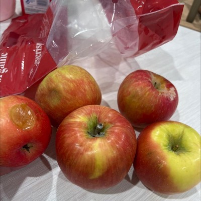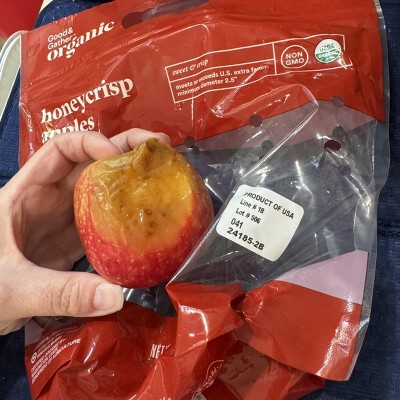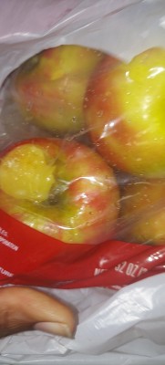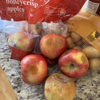 Rotten apples. Today I bought two bags of organic honey crisp apples. They were delivered to my car, I drove home and discovered one bag had 100% rotten, bruised and dripping apples.