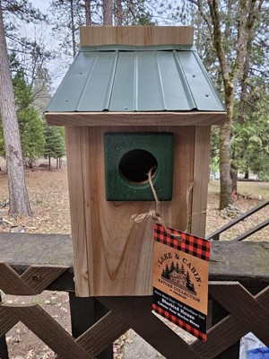 [This review was collected as part of a promotion.] I’ve been wanting a birdhouse for two years and somehow never made it happen, but boy this one’s perfect! I love the simple design of raw wood and green tin roof. I get quite a few blue birds in this area and am excited to have a little nook for them to perch in. My only reason for 4 and not 5 stars is the opening design of the birdhouse. I’d prefer something that opened down instead of up but also understand it may be better this way so the birds don’t accidentally weigh it open!
