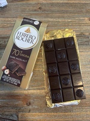 [This review was collected as part of a promotion.] I received the Ferrero Rocher 70% Cocoa Dark Hazelnut Bar from Influenster for free in exchange for my honest review. This chocolate bar is absolutely delicious! I love that it’s more affordable than some higher end chocolate bars but just as good if not better. The 70% dark chocolate is mildly sweet, but not as cloyingly sweet as milk chocolate which makes this bar very enjoyable. I love the crunch of hazelnut in the filling and would frankly love even more hazelnut, but that’s just a personal preference. I appreciate that this bar breaks into little squares so that I feel content having one square after dinner for a very small treat. It definitely satisfies my sweet tooth! But being honest, there were some nights I needed more than one square because dang it’s good. I highly recommend this chocolate hazelnut bar and plan on buying it again!