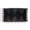 A durable, high-quality rug made from recycled leather and black and white cotton yarn. Modern, black triangles and white stripes create an optical diamond pattern that is finished with tassels on each end. The boho or modern farmhouse style aesthetic of this rug is perfect for any doorway. Hand woven by artisans in India.