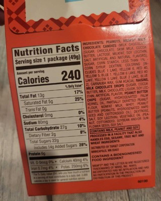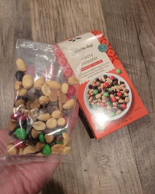 I have a weakness for anything sweet and salty, especially when it includes chocolate and peanuts. The Merry Monster mix is delicious. I love the blend of flavors and textures, including peanuts, raisins, red and green M & M's, chocolate chips and peanut butter chips. The bag is pretty small, but perfect for portion control. I received an incentive to write this review.