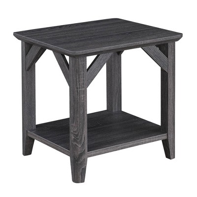 The contemporary wood end table in gray cuts a stylish shape with its dramatically curved legs and chic square handles. Storage is covered with the lower shelf and upper drawer. Crafted of solid wood, wood veneer, and MDF, a gray finish puts the final bit of polish on this end table.