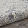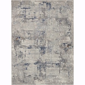 An abstract pattern with brush strokes adds intrigue to this modern Nourison rug. Ivory and grey fibers form a neutral base with gentle pops of blue and flecks of gold. Borderless design and a hint of sheen give it a contemporary feel that will work well in almost any room.