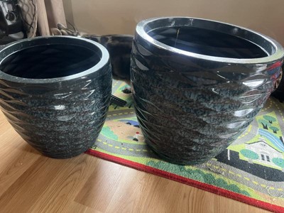 [This review was collected as part of a promotion.] These planters are very sturdy and pretty planters that will blend with any decor . I like the embossed wave pattern which is very eye catching. I transferred my snake plant into the large planter and planted a Chinese Evergreen plant into the smaller planter with ease. I have both plants in my sun room where I spend a lot of time relaxing .