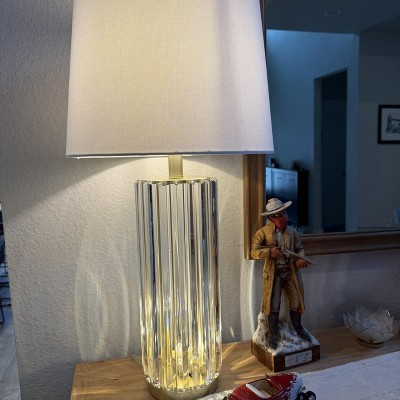 The lamp is a lovely column with a beautiful shade. However, the plastic (they’re not glass) vertical pieces are smudgy inside, with no way to clean. The nightlight is nice.