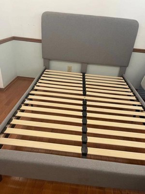[This review was collected as part of a promotion.] I have been in the market for a new platform type bed frame for sometime now. I have a plain metal one now but honestly it is not meeting my needs. I wanted a frame where my mattress actually did not move, slide around or require some kind of adhesive to stay put. This frame met all my needs and it came with an attached headboard! My first love for this frame came from the fact that my pillow are no longer lost behind my bed, the headboard keeps them fairly in place and I am no longer waking up in the middle of the night to find my lost pillows. My bed also has not moved unexpectedly due to the rounded corners on the side of the frame. My mattress is "locked in" to the frame and does not wiggle around. I also really like how the headboard is not just wood but upholstered with a fabric that matches all of my sheets and bedroom décor. I like being able to sit up and read with my back against it and not require a dozen pillows to feel comfortable. My only issue I had with this frame was the box it was delivered in. The company used a thinner cardboard box so by the time it got to me the plastic straps on the side had dug completely though the box in the 4 spots it touched on the sides of the box. I could see into the box (almost shove my whole arm in) by the time It arrived to my door and the plastic straps were about to rip off from the Fedex guy using them as "handles" Other then that the frame itself came undamaged in one piece. I would recommend this frame to anyone looking for a simple platform bed, or just anyone who hates the need to purchase a box spring just to use the basic metal frames mattresses sit on.