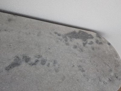 Stunning piece! This looks more expensive in person. Has a blue gray hue to it. Comes fully assembled and very heavy. Quality is an A plus.