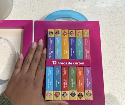 Los 12 libros vienen en un estuche duradero y colorido con un mango conveniente para que la aventura pueda continuar donde quiera que vaya. Este estuche está perfectamente dimensionado para que su niño lo puede llevar donde vaya. Les encantará llevárselos y sacar los libros y volver a ponerlos. Es ideal para desarrollar habilidades motoras tempranas. --------------------------------------------------- This 12-book set explores all the different qualities that make a princess a princess. Learn how to be adventurous with Moana, determined with Tiana, curious with Ariel and more! Includes princesses: Cinderella, Rapunzel from Tangled, Snow White from Snow White and the Seven Dwarfs, Belle from Beauty and the Beast, Pocahontas, Jasmine from Aladdin, Mulan, and Aurora from Sleeping Beauty.