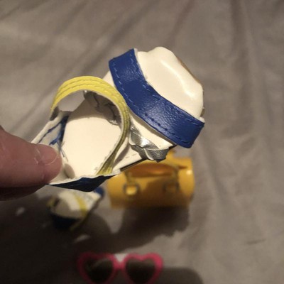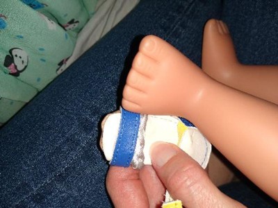 The outfit is really cute but one shoe is nearly impossible to get on. The strap looks like it's sewn to the wrong place.