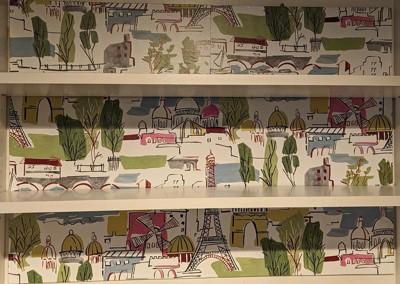 If you have a neutral or pastel-colored room that is lacking something, I highly recommend adding this to a wall or section of a wall. This really feels like happiness; the colors, shapes, and slight watercolor texture all come together beautifully. I have a small kitchen that doesn't have a large enough wall for this pattern, so I used it in the area behind the shelving with cabinet doors removed. It is thicker than some peel and stick wallpapers I've used, and has an eggshell type of finish. It was a little challenging to line up since it has an offset, so definitely measure twice and order extra with that in mind.