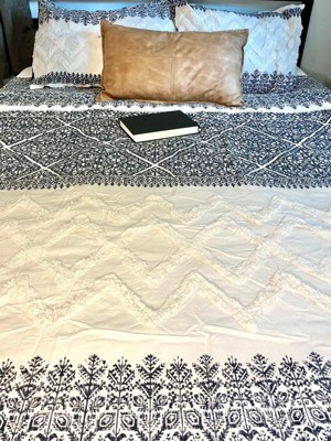 Fill your sleep space with the chic elegance and year-round comfort of the Mila Cotton Printed Bedding. The decorative bedding collection includes a rich assortment of comforters, duvet covers and matching shams, along with a charming mix of lumbar and square throw pillows to transform your bedroom into a restful retreat, while the cotton construction of each piece ensures year-round comfortable use. The comforter and duvet cover are decked out in a botanical-inspired print, centered with a chevron pattern made of chenille tufting, while embroidered and textured pattern grace the lumbar and square pillow for eye-catching appeal. Envelope and zipper closure on the shams and pillows, and button closure on the duvet covers allow for easy removal of the insert for cleaning and maintenance.