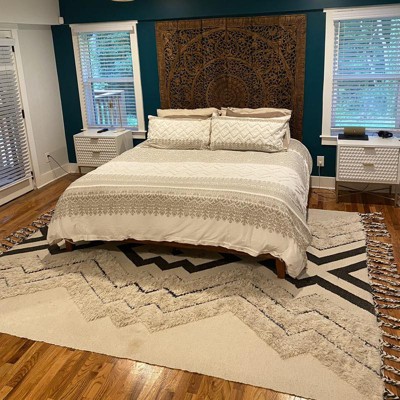 [This review was collected as part of a promotion.] This duvet cover is a nice way to add a new look to the bedroom and keep a comforter clean. I really liked the pattern and the Queen size was a great fit for a queen comforter, probably 1 extra inch on each side so it fit snug but not too tight. The button across the bottom for inserting a comforter were hidden well so you can't tell it's a cover compared to an entire comforter which I like a lot, and the pillow cases have an overlapping slit on the back rather than buttons/zippers which I also like. When it first came it had a strong smell and I had to leave it in a different room, but I'm guessing that will go away soon or after a wash. The one thing I don't like is that the material feels a little rough. It is 100% cotton but not soft cotton like a shirt, this is probably ok for most people since you're usually just touching your sheets anyway. Overall it's a very nice design and an easy way to update the look of your bedroom and keep your comforter clean!