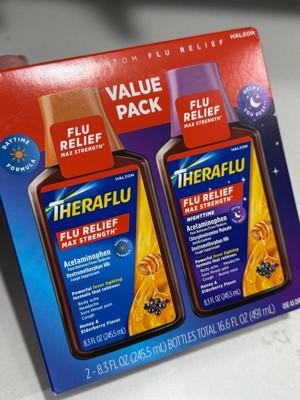 • Two pack 8.3 fl oz bottles of Theraflu Max Strength Daytime and Nighttime Flu Symptom Relief
