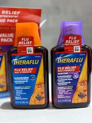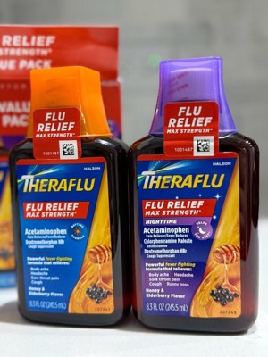 Theraflu Max Strength (1) Daytime and Nighttime Flu Medicine for Flu Symptom Relief Bundle fights your worst flu symptoms fast. Each type of Theraflu syrup delivers powerful flu medicine for flu symptom relief with delicious honey and elderberry flavor. Each dose of daytime over the counter flu medication for flu symptom relief provides powerful pain relief, headache relief, cough relief, body ache pain relief, and each dose of nighttime flu symptom relief delivers pain relief, headache relief, cough relief, body ache pain relief and relief from runny nose. Theraflu Daytime flu medicine for flu symptom relief delivers multi-symptom relief through a combination of dextromethorphan HBr, which is a cough suppressant, acetaminophen, which is a pain reliever and fever reducer. Theraflu Nighttime combines these benefits with chlorpheniramine maleate, which is an antihistamine. Take one of these medicines every six hours as needed for cold and flu symptom relief. Do not take both products simultaneously. Get powerful relief so you can recover with Theraflu.