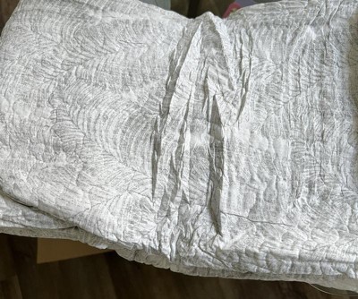 Our Tommy Bahama Distressed Water leaves quilt set features an allover printed gray fern design on a white ground. The reverse is a textured light gray. This quilt is 100% cotton, with a cotton (80%)/polyester (20%) filling, lightweight and easy to layer. The shams feature a two piece back closure. The corners of the quilt are rounded to match the sham, both edges are finished with a fabric binding. This quilt set is fully reversible. We have reduced our packaging footprint to be more sustainable. Your quilt set will arrive secured with a ribbon. The set includes 1 quilt and 2 shams (1 sham for the twin set). Machine washable, for easy care.