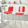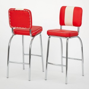 The 30” Raleigh Retro Stool (Set of 2) from Buylateral is reminiscent of Mid-Century design once found in the American diner. Constructed with chrome plated legs and vegan leather upholstery, these stools offer generous cushioning. This vintage design is upholstered in red with a contrasting white racing stripe down the center of the back rest. The high back rest and footrest provide added comfort to these 30-inch seat height stools.