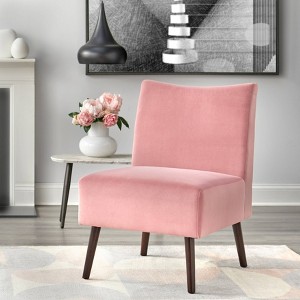 Refresh your living space with the Petula Armless Accent Chair by angelo:HOME. Mid-Century inspired; this chair offers a supportive seat with simple lines that allow it to easily coordinate with many styles of interiors. Generous foam cushioning and solid rubberwood legs in a dark finish complements the eye-catching lush champaign pink velvet fabric. The perfect accent chair in your living room, bedroom, or place two side by side for symmetry and effortless conversation.